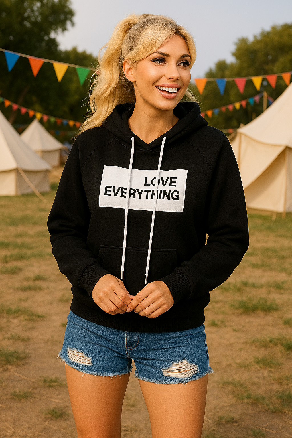 Zeg het hardop zonder iets te zeggen. Deze oversized zwarte hoodie met de krachtige tekst LOVE EVERYTHING op de borst is jouw go-to item voor cozy vibes met een attitude. Gemaakt van een zachte katoenmix met een comfortabele fit, verstelbare capuchon met witte koorden (afgewerkt met aluminium uiteindes) en een subtiel elastische boord. Perfect voor frisse festivalavonden, kampeerweekenden of gewoon chillen in stijl. Combineer met je favoriete denim short en slippers voor de ultieme laid-back look.